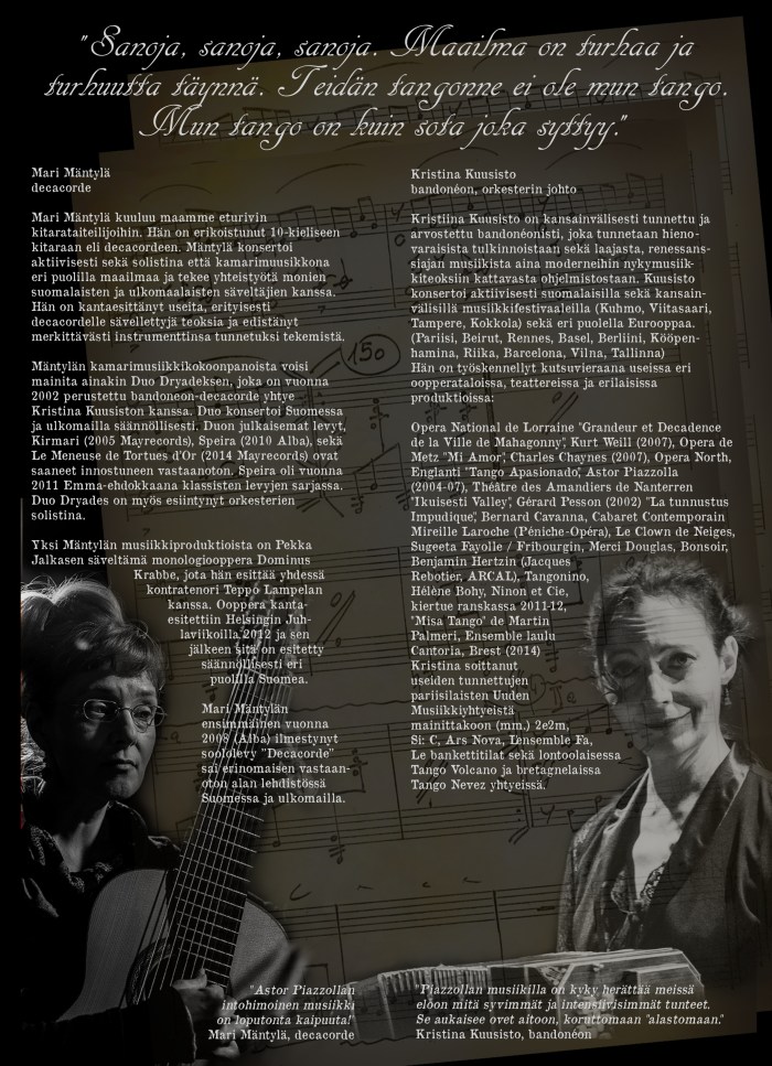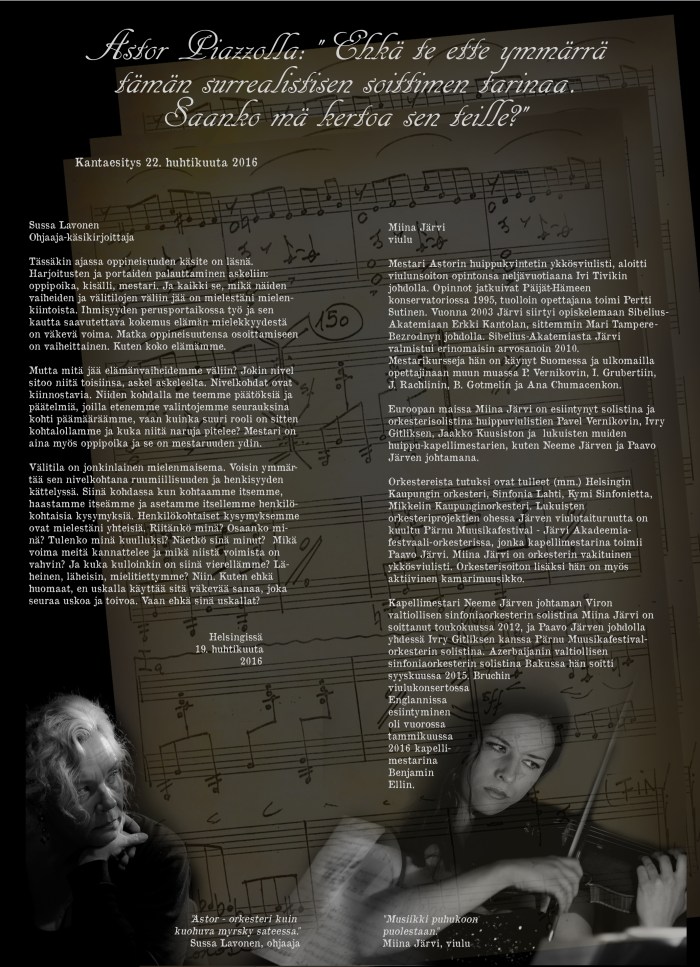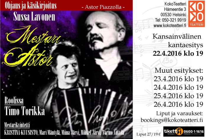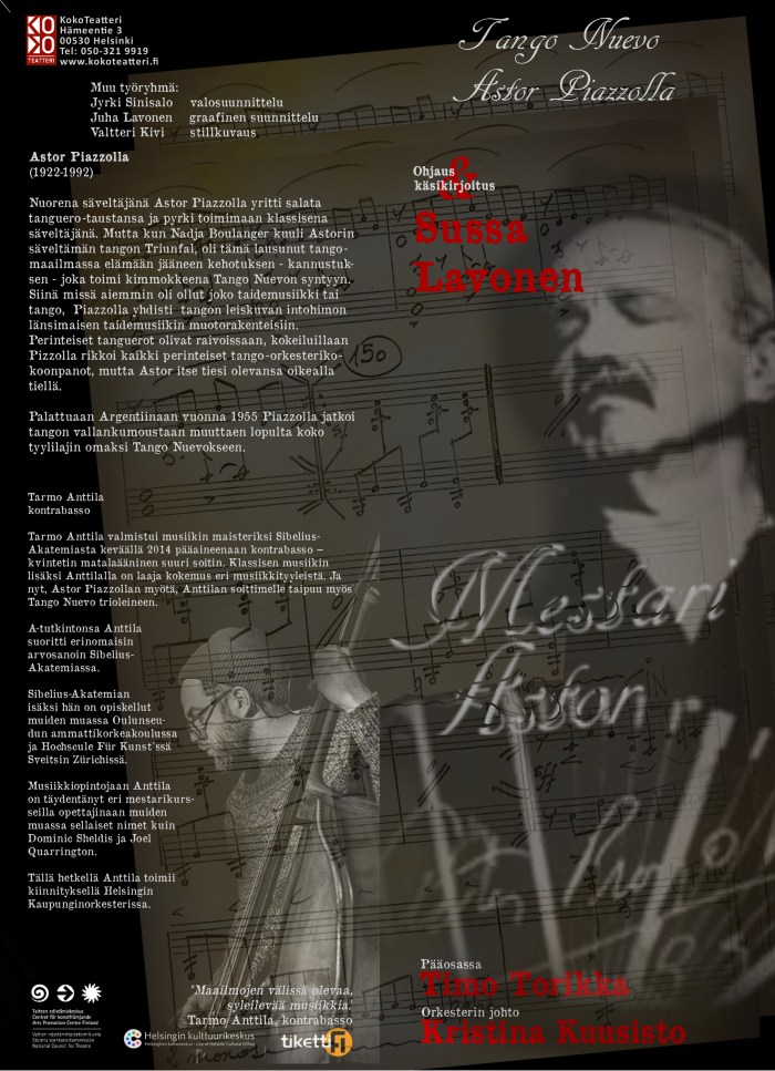 TeM Sussa Lavosen käsikirjoittama ja ohjaama monologi Tango Nuevon isän Astor Piazzollan elämästä, musiikista ja ajatuksista. Monologi kantaesitettiin Suomessa KokoTeatterin näyttämöllä huhtikuussa 2016 ja sen jälkeen esitys nähtiin Kainuun Runoviikoilla, Sata-Häme Soi-tapahtumassa, Kangasala Talossa sekä Tampereen Teatterikesän pääteltassa.